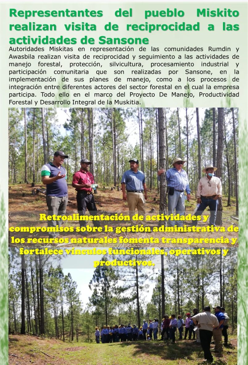 Autoridades Miskitas en representación de las comunidades Rumdin y Awasbila realizan visita de reciprocidad y seguimiento a las actividades de manejo forestal, protección, silvicultura, procesamiento industrial y participación comunitaria que son realizadas por Sansone, en la implementación de sus planes de manejo, como a los procesos de integración entre diferentes actores del sector forestal en el cual la empresa participa. ¡Todo ello en el marco del Proyecto De Manejo, Productividad Foresta! Y Desarrollo Integral de la Muskitia.