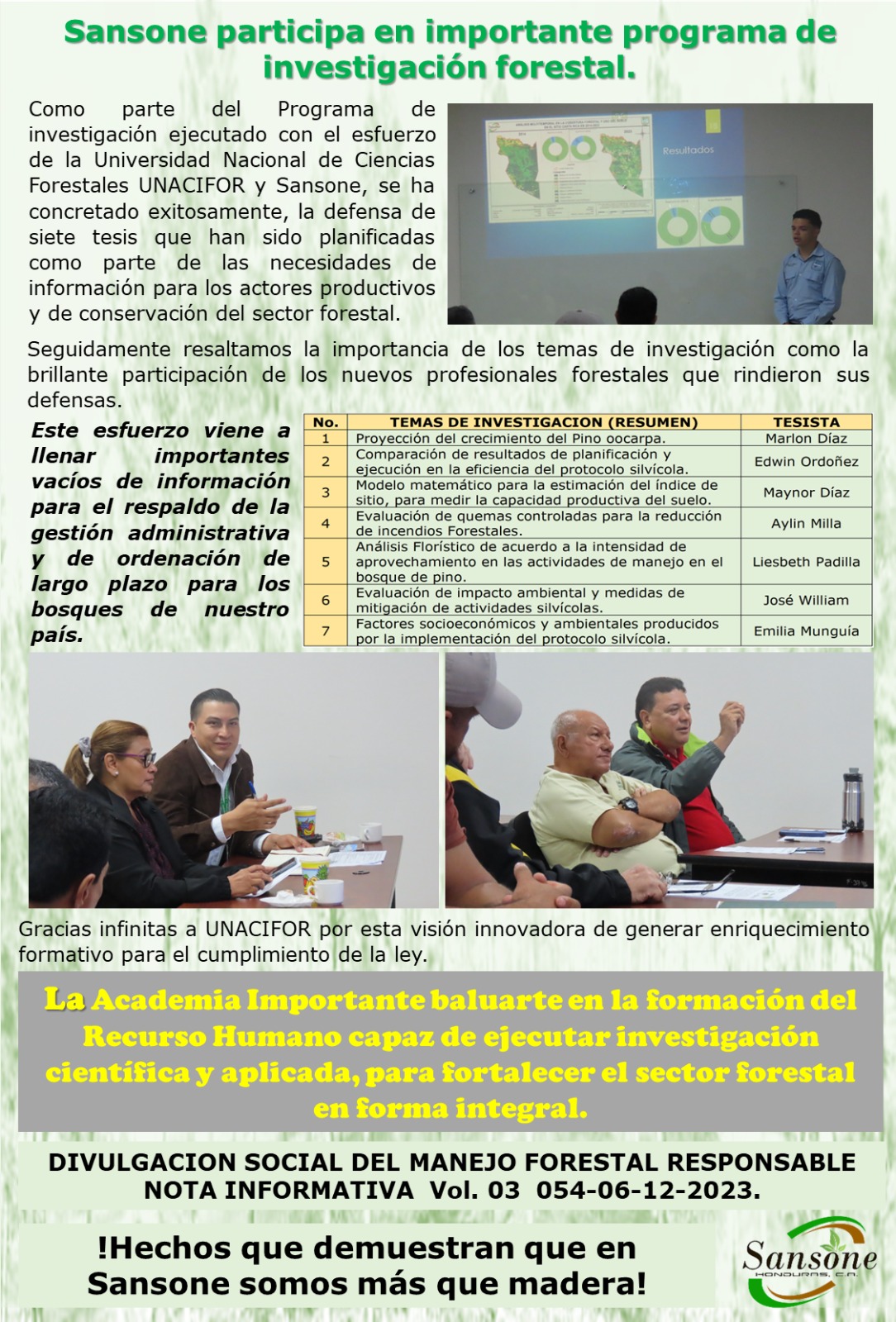 Como parte del Programa de investigación ejecutado con el esfuerzo de la Universidad acional de Ciencias Forestales IJNACIFOR y Sansone, se ha concretado exitosamente, la defensa de siete tesis que han sido planificadas como parte de las necesidades de información para los actores productivos y de conservación del sector forestal.